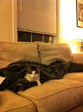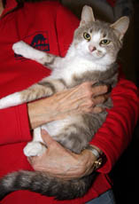 Dusty Rose, a lithe one year old, makes it her business to follow you wherever you go and to get stroked as often as you are willing. She will also gladly settle on your lap or your bed. She would be happy to be your one and only but is playful and altogether sociable with other cats. And we haven't mentioned how beautiful she is. She has symmetrical markings on her face but a random patchwork of pale gray, beige and white that mysteriously meet in a sharp seam in the middle of her back as if she were put together by an artsy-craftsy artist.