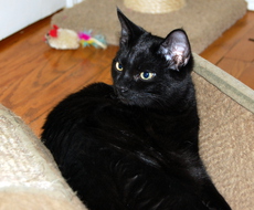 Desi is a lively, alert and super playful handsome black kitten, born in August 2012. This curious charmer loves life and will delight you with his antics! Living happily in a foster home at this time, Desi gets along with other cats and dogs as well. This wonderful boy is one cool, fun cat.