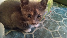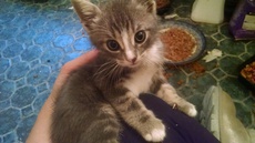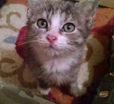 is about 12 weeks old, cloudy gray and white. She was found outside all alone but when we put her