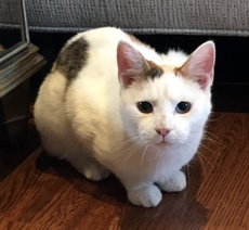 Domino is a lover and loves to cuddle. He loves a lap with petting until your arm will fall off. His markings are striking with black dots all over his body starting with one on his nose and one each on his ears ending with a black tail. Domino is 9 weeks old )as of 8/15/15) and very sweet. His sibling Nacho is also posted for adoption. LW