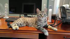 Very social Dax has many talents. He likes to help with the computer as long as you're not worried about typing accuracy. He's a friendly doorman to all, even learning to greet dogs. Dax can tell time and will let you now when dinner should be served. He is polite, loud purrs expressing his thanks. This handsome tabby was born around early Oct. He was rescued with his 4 litter mates also available on this website (Desiree, Chantilly, Gabrielle & Desmond).