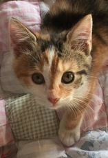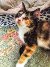 Daphne has the most distinctive and lovely calico markings! This approx. 10 week (as of 9-18-18) old kitten is a bundle of fun and joy. She sparkles like a rare jewel, is super affectionate and enjoys pets. A kitten not to be missed. Originally from West Virginia, Daphne now resides in a Westchester County foster home. (sm)