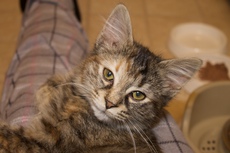 You won't meet a more cuddly cat than little Dot. About 6 months old (as of 12/1/10), she spent her first months in a tiny cage in a shelter and is now enjoying the new-found freedoms of a foster home. She will walk to her foster mom's feet and meow to be picked up and put on a lap. Once there, she will just purr loudly and sit there as long as she's allowed. She will even lie on her back with her head hanging down so she can get a belly rub. She loves to play and is fine with other cats and dogs, but her first love is people.