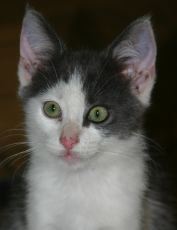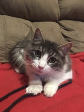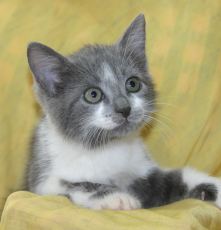 Dani (grey & white) is a very playful and curious female kitten. She enjoys playing with other kittens and is fearless when playing with the foster family's adult cat. After all the activity she enjoys a nice long nap! Dani gets along well with the two small dogs in the foster family.