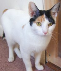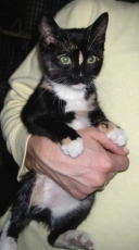 with a striking calico coat (black, white, and orange), was lucky that she and her kittens were fed by the workers in a machine shop and had an abandoned auto for refuge. But they were no longer wanted there, and, in any case, needed neutering and homes. Dorothy, with a round head and a compact body is wonderful for hugging. She is a little over a year old, good-natured with people, very friendly with other cats. She will make a great pet.
