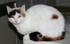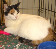 When she was put out by the landlord after his tenant, Dawn’s owner, went to a nursing home, Dawn parked herself on a chair on the front porch of her old home waiting for her human companion to return, no doubt. Fearing for her survival in the cold weather, a neighbor who has fed her for the last few months, brought her to Pet Rescue. She has made herself completely at home here, sniffing our place out and accepting hugs. She is very comfortable with our other animals and us people. It is time for this perfect little cat to replace the porch chair with a loving home. Although legally a calico, 2 year old Dawn is mostly snowy white and has a particularly colorful rear end.