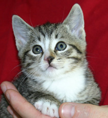 COMING SOON - One of the Valentines kittens, Dove is a soft gray tabby boy. Every litter this large has a comedian and Dove is that kitten. He's the first kitten to run for the bedroom door to come out into the house, the first one to climb on your shoulder for a better view, the first one to roll over and ask for belly rubs. Truly an interactive personality, this kitten is unforgettable. He settles down for purring after he tires himself out. Dove needs to be adopted with one of his siblings (Whisper, Phantom, Ripley, Gandolf, Spencer)or in house with other pets.