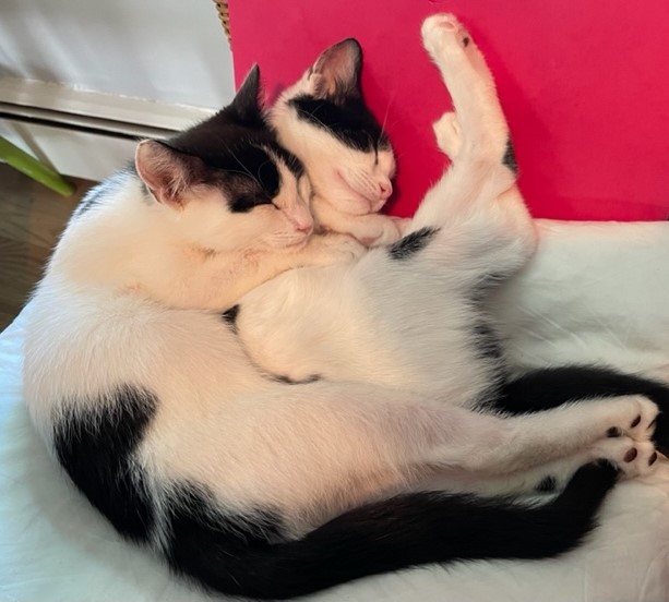 Born July 7, 2022 Meet Emma & Earl! Two exceptionally lovely, harlequin sibling kittens. Both are mostly white with random black spots & all black tails. Earl is slightly more outgoing; his favorite game is to fetch & bring a POM-POM! Once Emma has warmed up to you, she will come demand head rubs. Being in a foster home with teenaged kids exposed Emma & Earl to a good amount of commotion and they've become accustomed to being picked up, handled & cuddled. It would be wonderful if they could be adopted together as they are very bonded. We are certain they will bring great joy to their future family!