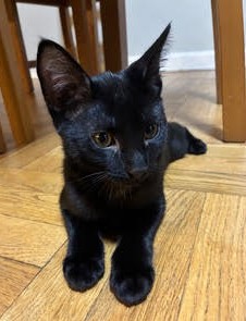 DOB: 8/17/25 Evon is a handsome, all-black boy, who is very affectionate. As soon as you make eye contact, he starts purring. When you call his name, he always answers. Even when he’s too sleepy to make a sound/speak, you can see his little red tongue, so you know he’s trying to respond. He’s full of energy and will explore anywhere that catches his interest. Evon is still cautious around new people and environments and may run for cover, but once he gets to know you, he relaxes and will be looking for a lap to fall asleep on. If you're looking for a pair, Evon would love to be adopted with his stripey sister Tiger Lily (posted separately).