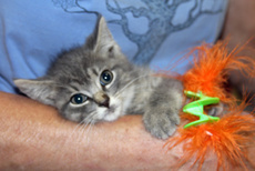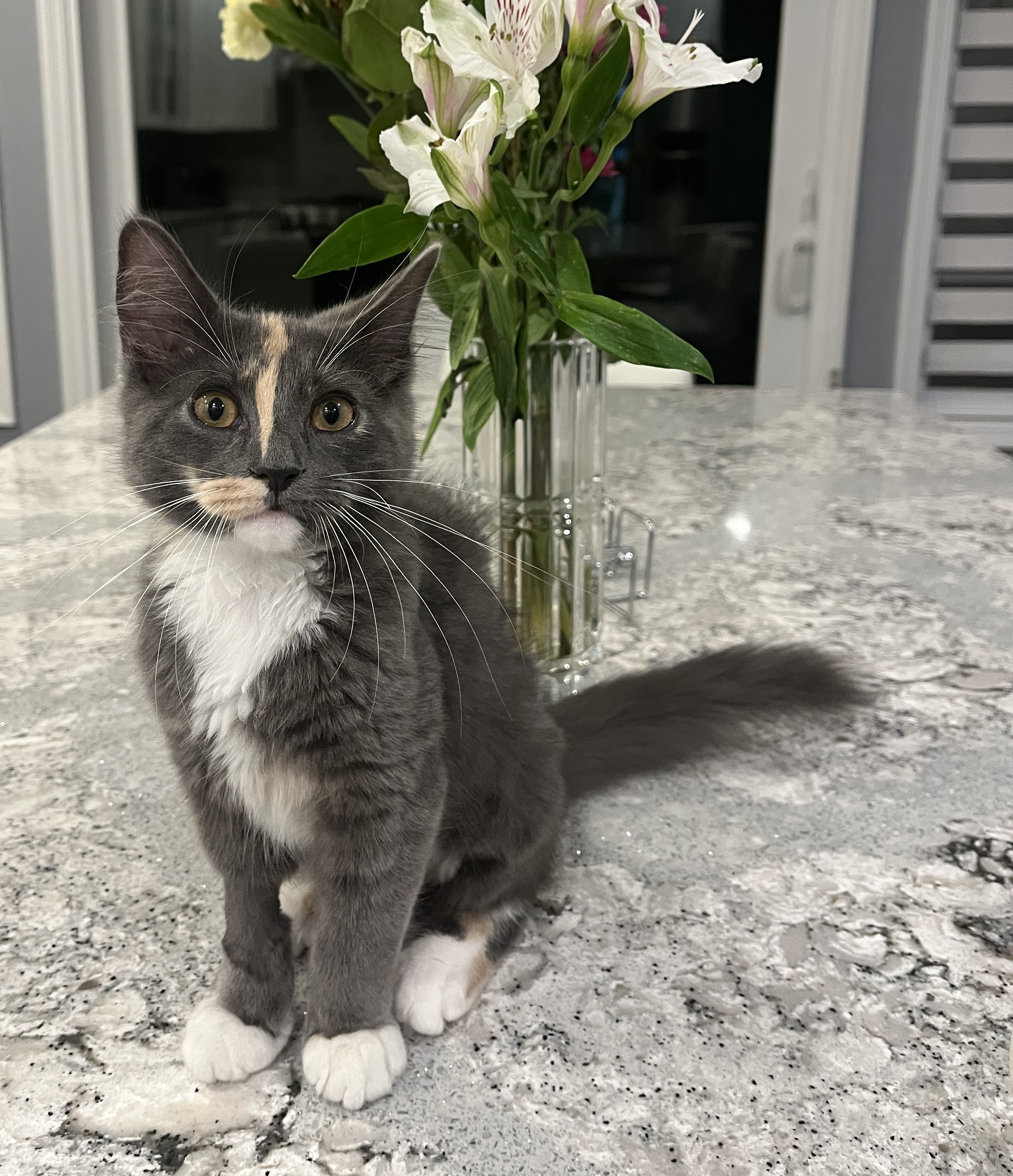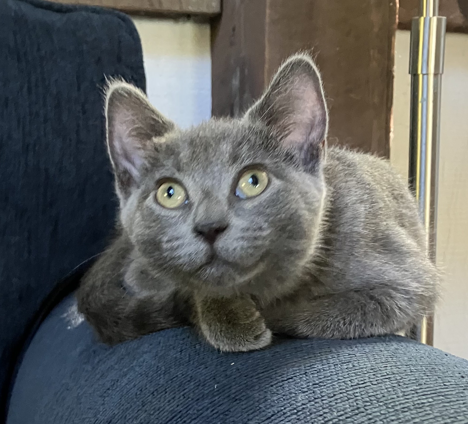 DOB: 2/24/25 Enya is a healthy, sweet, curious, and energetic kitten with slate gray fur and beautiful green eyes. She likes to be held, hugged, and petted. She holds her own with her brothers, tussles, chases, and plays. When she found a secret hole under the kitchen cabinets and crawled out of sight, her foster family called her Mouse for the day. She is persistent in attempting to be friends with an adult cat. Her foster family loves her!