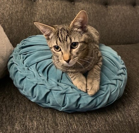 Born March 22, 2022 Meet Eliza! Eliza is a female kitten being cared for in a foster home with her brother, Knightley. Eliza is the smaller of the two but makes up for inches and ounces with her courage and daring! She was the first to reach the top of the cat tree, had no problem meeting our dog and two big cats and is never afraid to let her brother know that she can wrestle with the best of them. She loves dangled toys and first thing every morning she heads for her scratching board to stretch. She’s a great snuggler and will purr up a storm. Apply to adopt her and let her find all the sunny sleeping spots in your house!