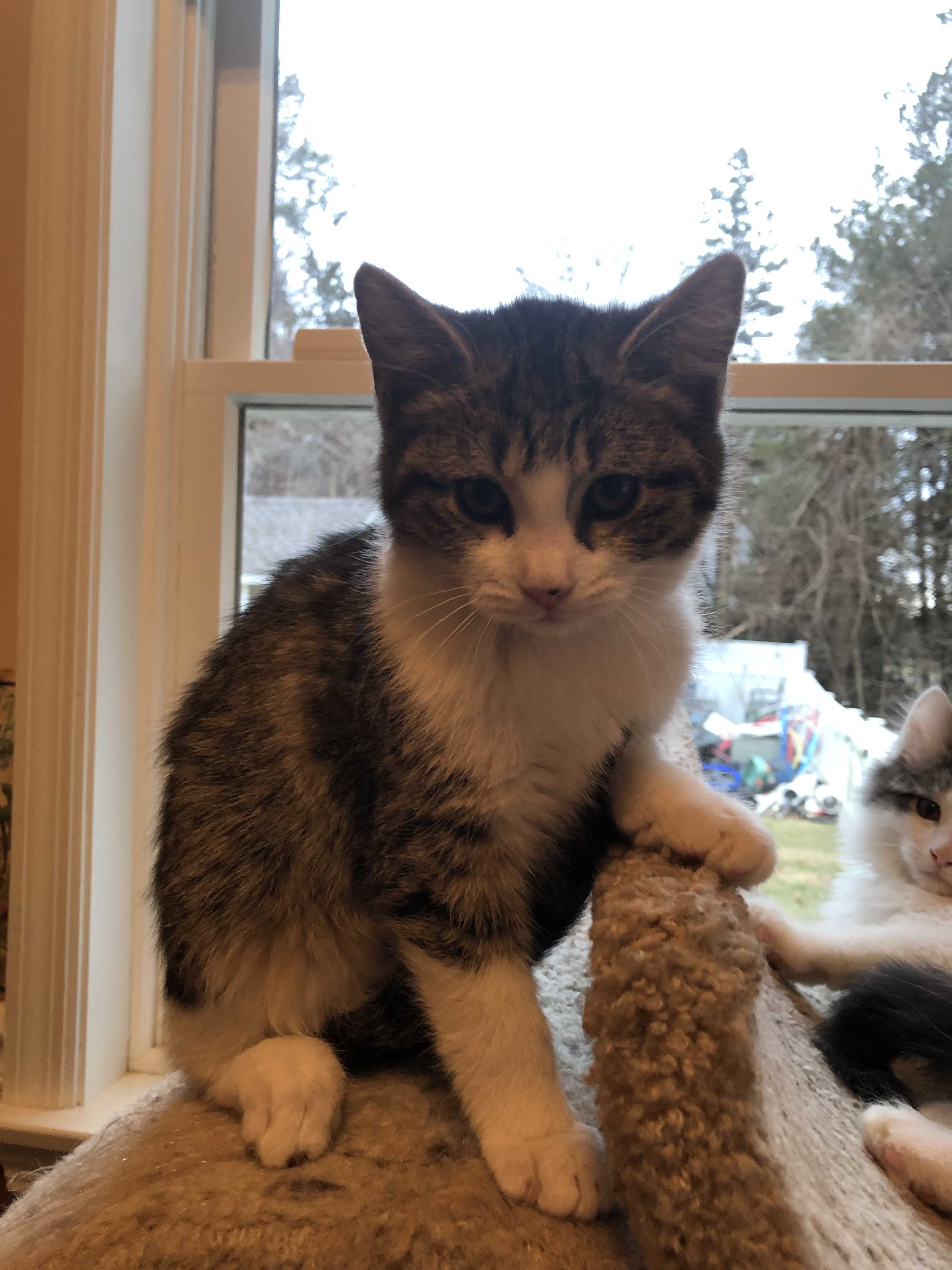 Edgar is a handsome polydactyl kitten who loves to play with all the cats in his foster home. He loves to observe the outdoors in any open window. Can be shy and slow to warm up but will let you pet him. He also loves to sleep on his foster moms bed at night! He lives with his 2 sisters and 4 other cats. He needs a forever home with another cat/cats. Born Sept. 2015.