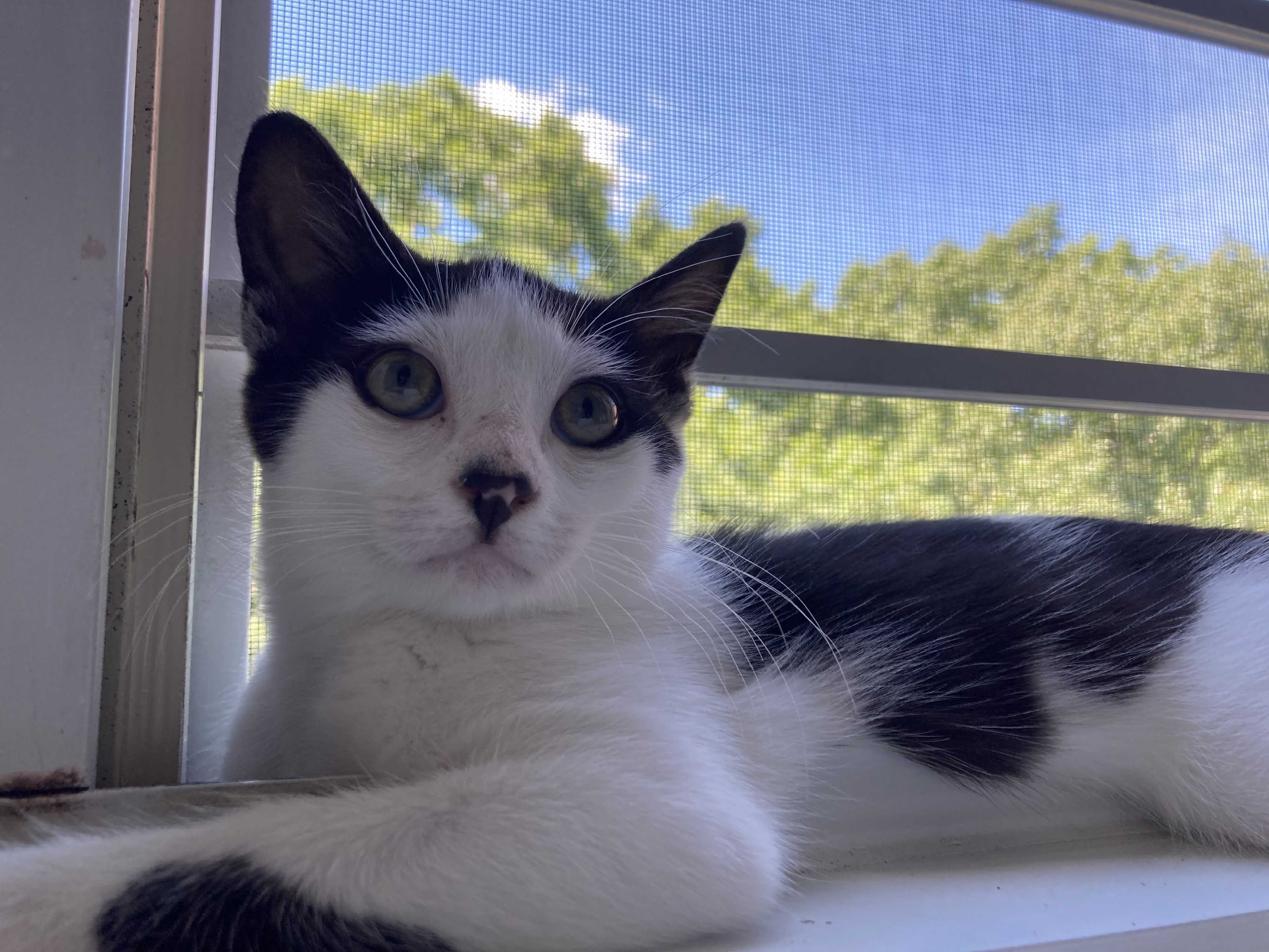 Born July 7, 2022 Meet Emma! An exceptionally lovely, harlequin sibling kitten. She is mostly white with random black spots & all black tail. Once Emma has warmed up to you, she will come demand head rubs. Being in a foster home with teenaged kids exposed Emma to a good amount of commotion and she became accustomed to being picked up, handled & cuddled. We prefer that Emma either be adopted with her brother Earl or into a household where there is another cat.