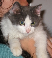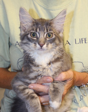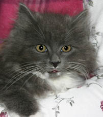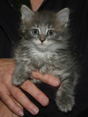 If you want a sweet loving kitten that will stay pretty close to kitten size, this beauty is for you. Eloise is a long-haired smoky gray with flecks of snow white around her head and chest. When she is not playing or taking a snooze, she loves to be held and will purr in your arms.