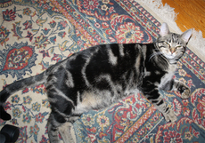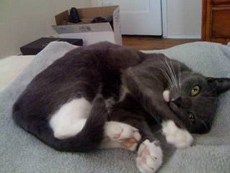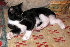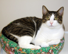 Ellie, round and cuddly, will grab a lap or a place on the desk or bed any time she can. She is always ready for affection and is particularly fond of Kerry, a handsome and wonderful black and white male, also listed on our website. Both of them are positive for FIV but have no symptoms and could live long lives.