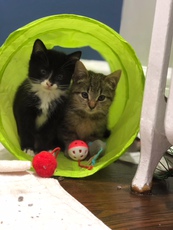 Elizabeth's Kittens are now two! Tater Tot (tuxedo male with white nose) and Chip (tuxedo male with black nose) remain following their sister's adoption on 12/2/18. About 11 weeks of age (as of 12/02/18), this is a lovely duo of sibling kittens. Tater Tot and Chip are sweet and just love snuggling with each other. The two boys enjoy playing with the toys that abound and learning all about their new foster home. (ep)