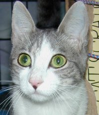 Hi! my name is Elsa and I am approximately two years old and a sleek nine pounds. As you can see I am beautifully coiffured in a gorgeous sleek grey and white coat with stunning and magnetic yellow eyes that shows my soul's wish for a home and family of my very own.
