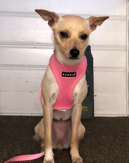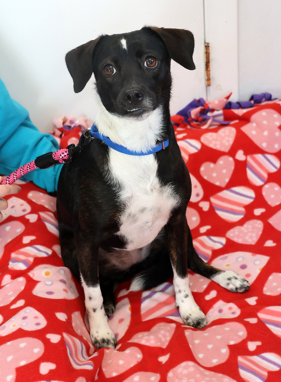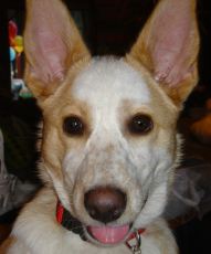 This sweet little pups is about 8 months old and around 28 lbs. She is so affectionate and sweet. She loves to play but is not rough. She just wins your heart over. She is great with other dogs too.