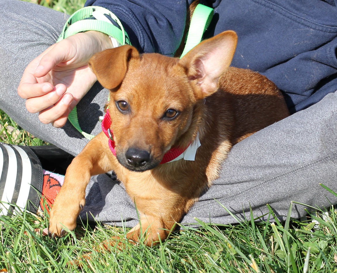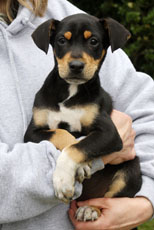 is one out of a litter of 4 puppies, about 9 weeks old and 8-10 lbs. They are all very sweet and playful, plus outgoing and snuggly too. Einstein has a smooth coat and is calm for a puppy his age. Please fill out an adoption application.
