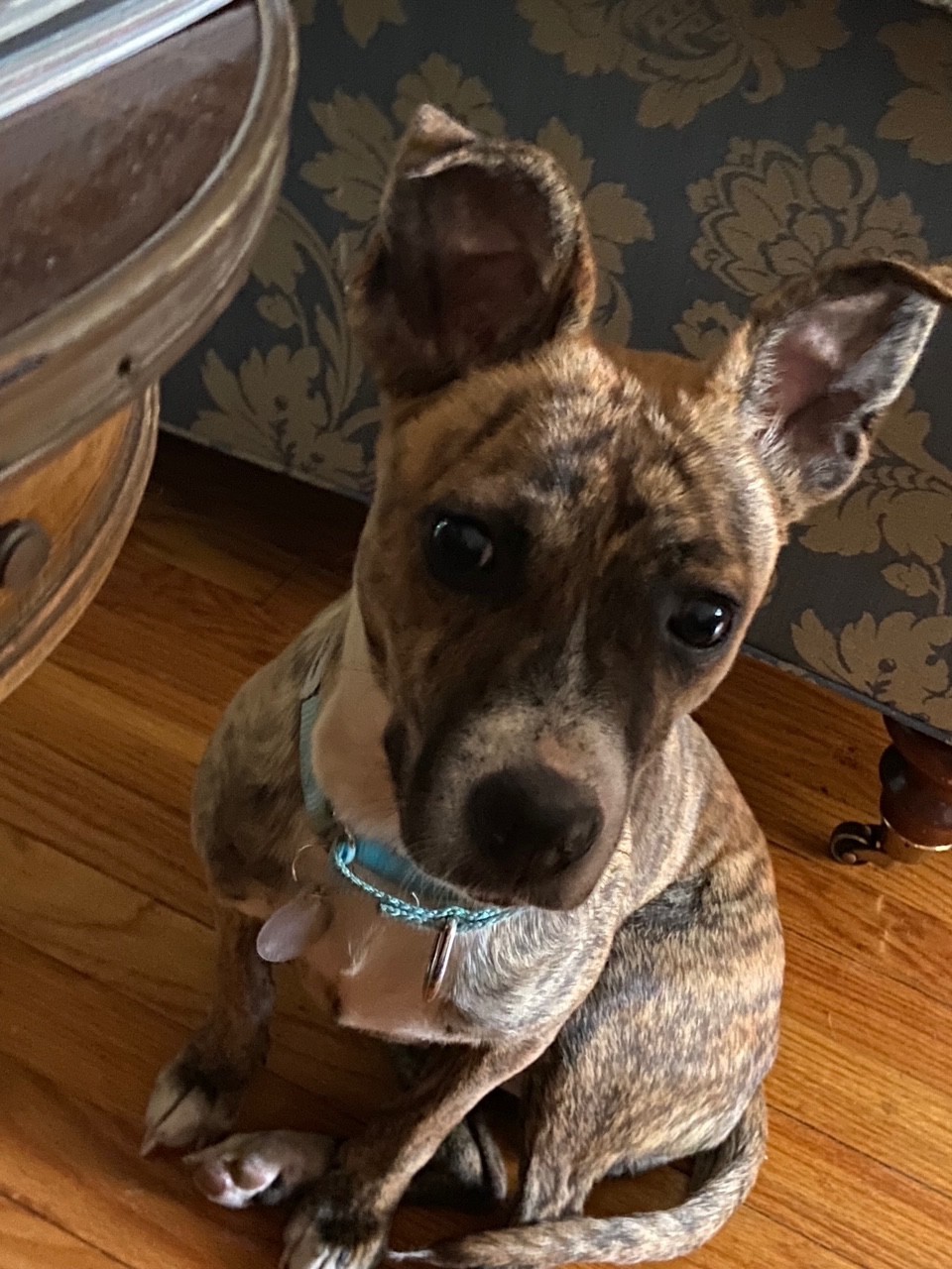 This is Esperanza!~...the dog with ears that go on forever. She’s a young, spirited, funny, medium sized girl of about 24lbs in a brindle suit who loves to play with her toy, fetch a ball, and frolic with doggie friends. Timid at first, Esperanza is super sweet, and comes around as she gets to know you. She is extremely gentle and alert, eager to learn and will do well with any family who values sweetness and loyalty. Essie is extremely friendly with other dogs, big or small. She is playful and eager to love and be loved in return. She’s a true lifelong friend! If you are interested in this dog, please submit an application directly to our website at www.ny-petrescue.org. Only applications submitted directly to Petrescue will be considered.