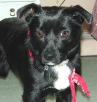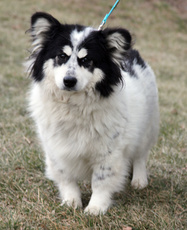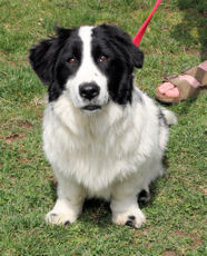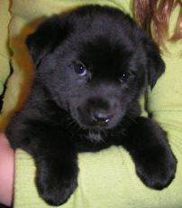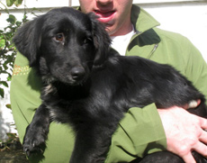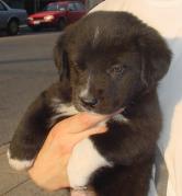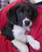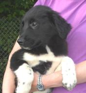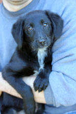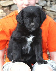 Ernie is a 12 week old, 25 lb "Borderland" (Border collie, Newfoundland mix). I little shy at first, Ernie is learning that people are his friends. He loves chew toys and playing in the yard with the other dogs. He has the loping run of a puppy who is too small for his feet. He will likely turn out to be a large dog. He is paper-trained and good with cats. Ernie would prefer a home with another dog to show him how good life works and older children.