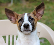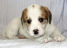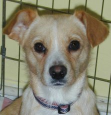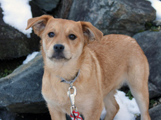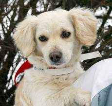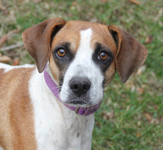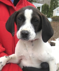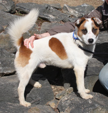 Eli is a cute young beagle/spaniel mix with a great disposition. He's about 30 lbs and a year old. He is affectionate, gets along great with other dogs and has a nice easy manner. He is housebroken and waits by the front door when he wants to go out. He is very playful and loves chew toys. He comes when called. Eli loves to play in the snow and look at himself in the mirror. He is very trusting and likes to sit by my feet. He appears to be very intelligent, but most of all he is very cute! Eli has a beautiful white short haired coat with some large beige blotches of color. He is adorable. Eli should not go to a home with cats.