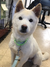 Ethan is a cuddly 7 month old Jindo mix puppy who weighs 17 lbs. Ethan was found chained to a pole at a Korean dog meat farm before he arrived at Pet Rescue. He is absolutely adorable and very sweet! He loves playing with other dogs and enjoys being around people.