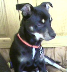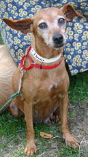 is a sweetie, about 8 years old and 12 lbs. She looks like a Miniature Pinscher with a little Chihuahua mixed in. Her foster mom says she is a very gentle and affectionate dog. She would be a perfect apartment dog for a senior person. She is good with cats & dogs and not barky. This dog is as easy as having a cat. She just wants someone gentle to love her. Please fill out an adoption application.