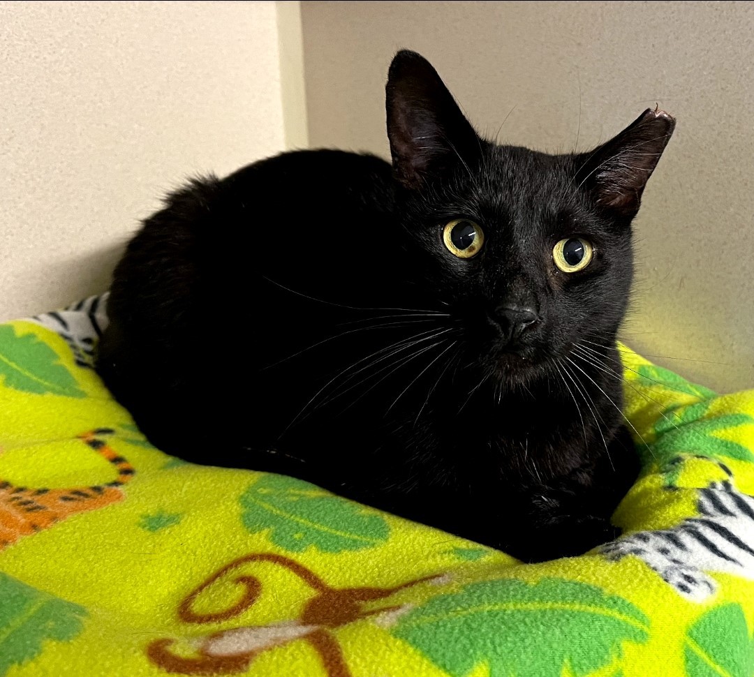 DOB: 10/6/24. Holly is a sweet cat with shiny black fur! Although a bit shy, she is a gentle and loving companion. She likes to rub her head against your hand for more rubs along her back. To meet her is to fall in love with her.