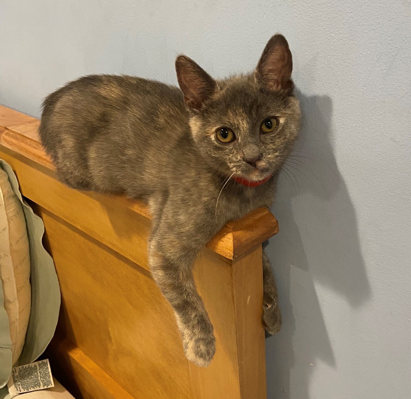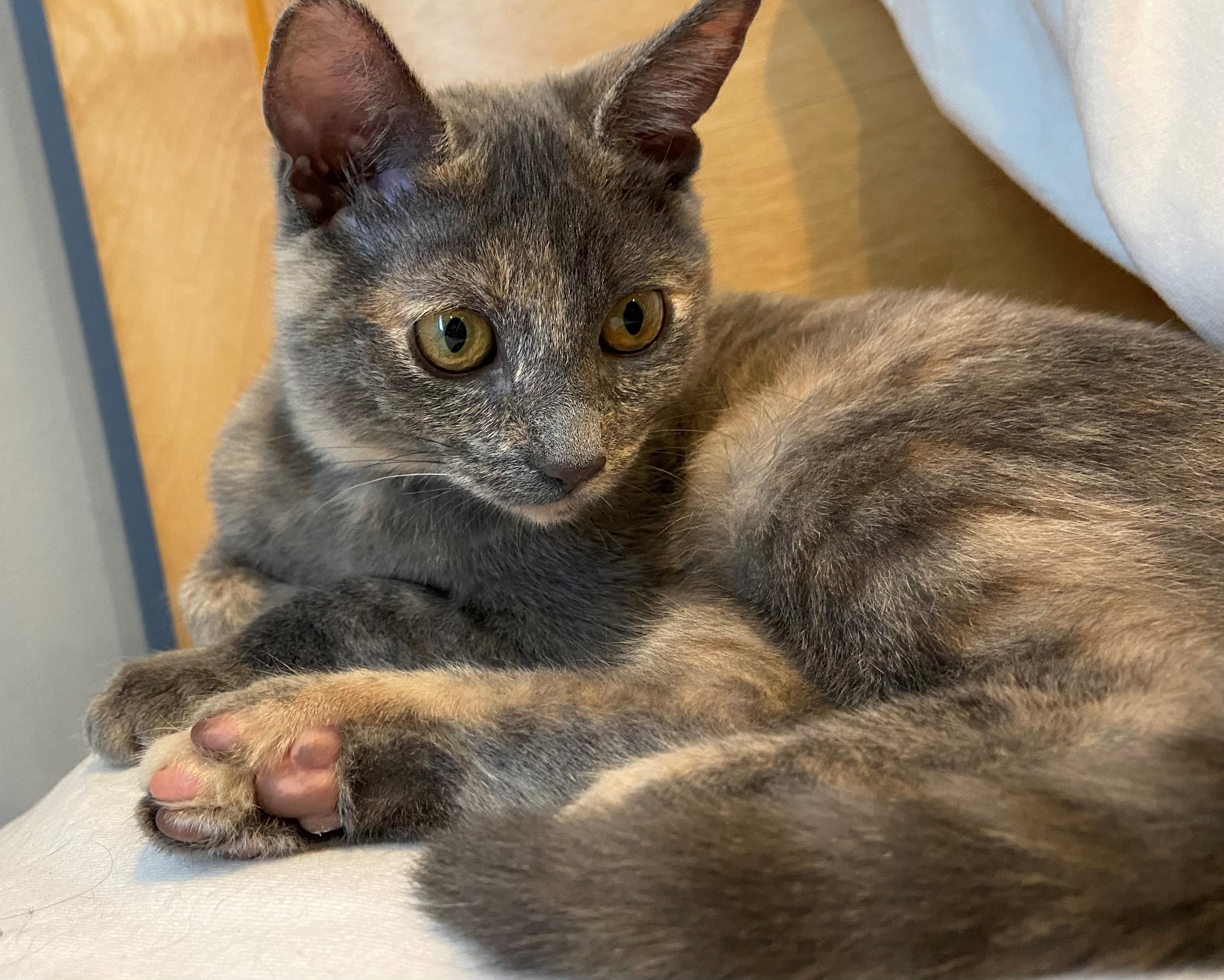a playful 6 month old has an unusually beautiful pale tortoise coat. She's