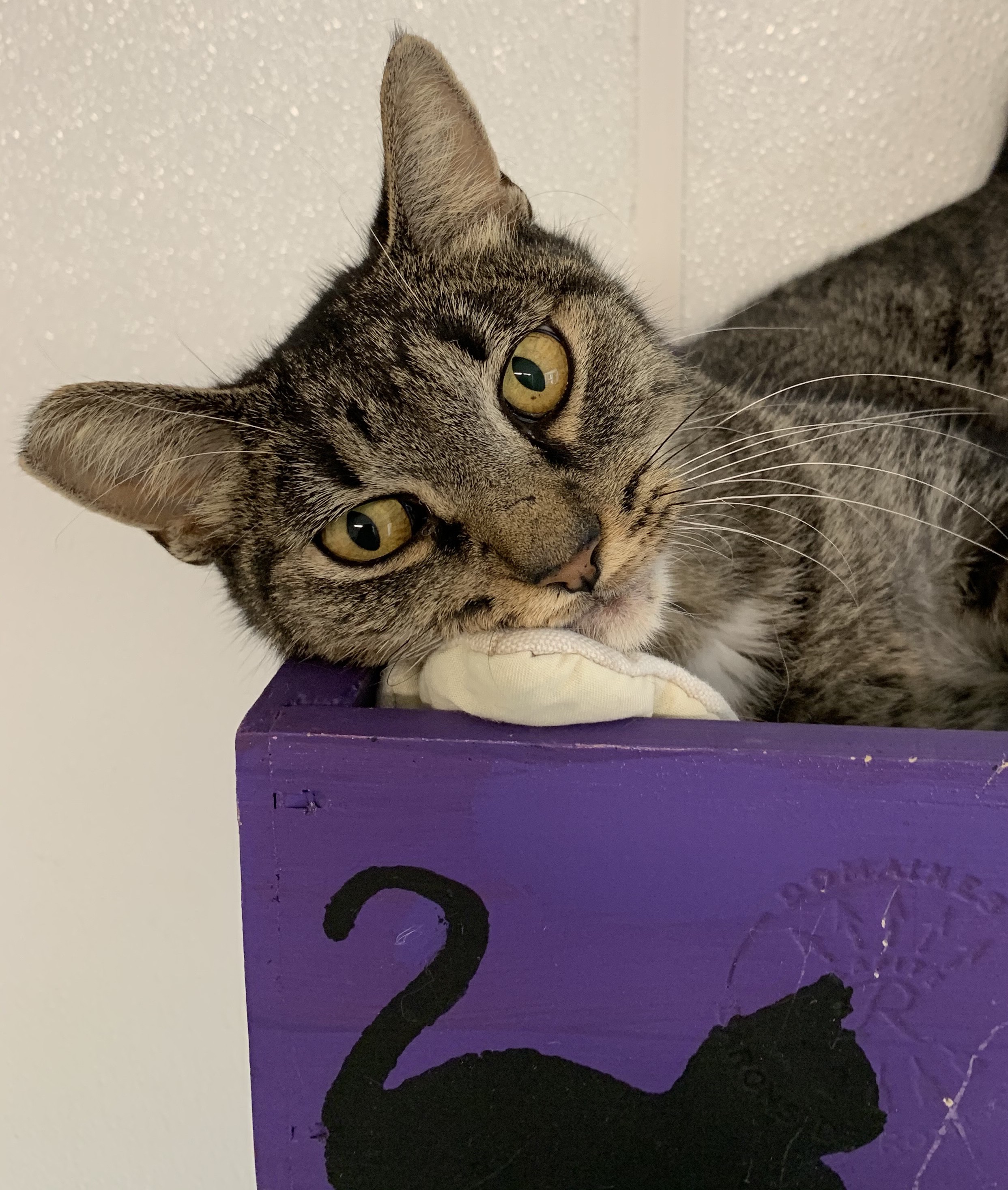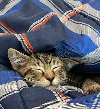 Born May 2020 Hunter is a small tabby boy with a fun loving personality. He enjoys catching whatever happens to be flying at the end of a wand toy. If his people are too busy to play, he simply tosses his toy mouse up in the air himself and pounces when it lands. Hunter may be fierce with his toys but he's gentle with people. He enjoys chin rubs and ear scratches and he doesn't mind if you interrupt his nap with pets. Hunter gets along with other friendly cats, particularly the girls. He's quite charming.