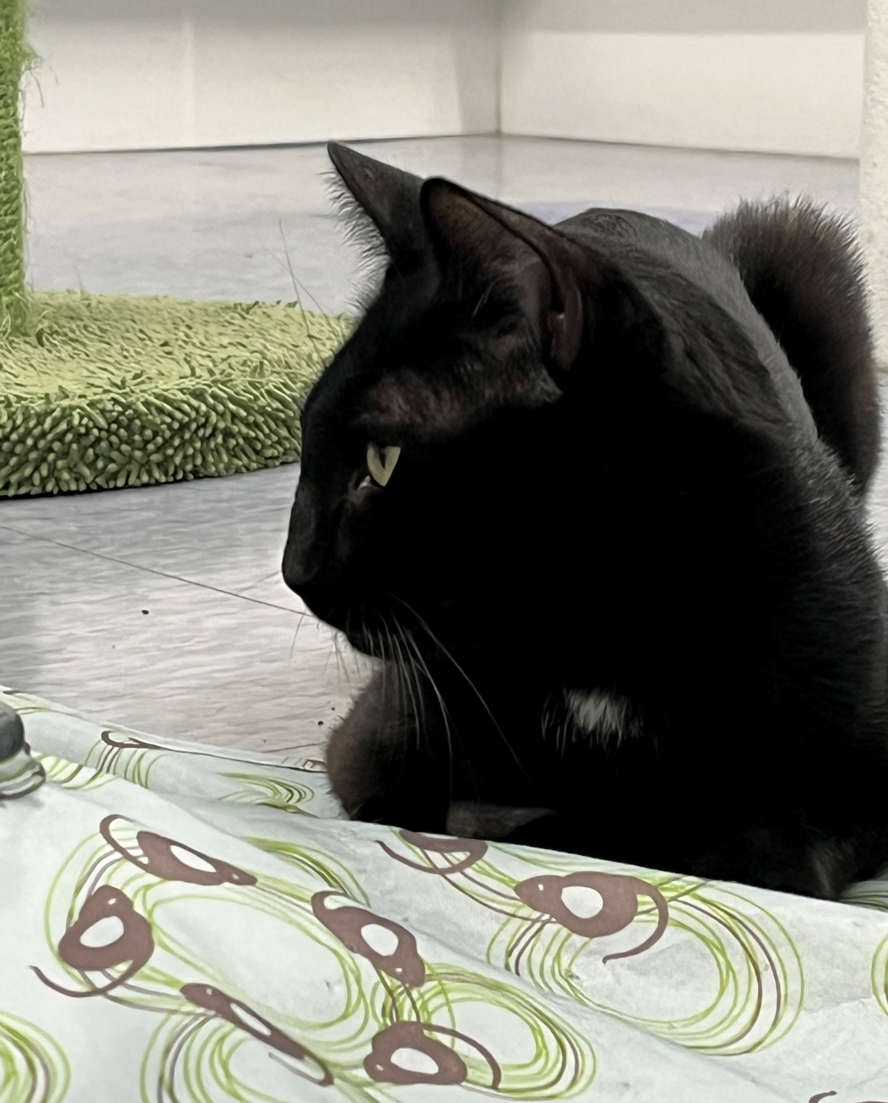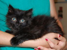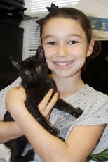 Adoption Pending Born March 24, 2022 Hannah is an adorable friendly silky black kitten. Along with her sister Honey, she was born on March 24, and will brighten up any home. She will do well in any household. She loves watching TV with her people, but also enjoys playing. She loves her humans and will start purring loudly as soon as she hears them come into a room. Hannah's hobbies include jumping on things and hiding in small places. She is one very special kitten!!