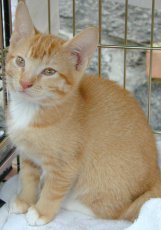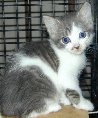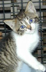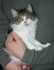 is about 6 months old and just the sweetest kitten out there. If you pick him up he tends to settle right in. If he is playing, he plays very gentle. He is a big purring machine and takes any oportunity to show his purr off. He is used to other cats and dogs from his foster home.