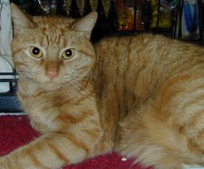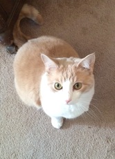 is about 3 years old and very loving. He was given up by his owner who was not allowed to have a cat in her apt. A big, gorgeous orange cat with a big appetite!