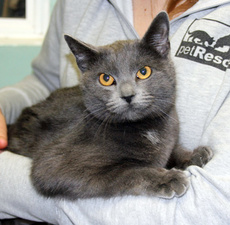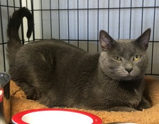 Haze is a beautiful declawed Russian Blue mix, about four years old. He is very sweet and affectionate - keeps bumping you with his head for more scratches and rubs. If you like Russian Blues, you'll adore this gentle boy.