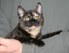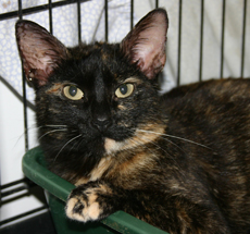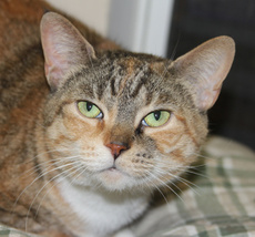 Hannah is one gorgeous torbie! That mix of tabby, tortie and calico is amazing. But this honey is not only beautiful, but has a warm and winning personality to boot. Hannah loves to be petted and will warm up to a friendly, tender touch in an instant. About 1 1/2 years old, Hannah gets along with other cats and we feel she will do well in a family.