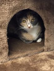 Born March 24, 2022 Honey (muted torti) is an adorable friendly kitten. Along with her sister Hannah, she was born on March 24, and will brighten up any home. She will do well in any household. She loves watching TV with her people, but also enjoys playing. She loves her humans and will start purring loudly as soon as she hears them come into a room. Honey's hobbies include chasing pretend mice and being held like a baby. She is one very special kitten!!