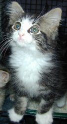 is a very sweet cuddly kitten, about 14 weeks old. She is friendly and has a very soft and silky coat. She is the perfect combination of being playful yet loves to snuggle.
