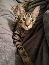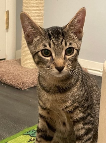 Born mid-August 2021 Lyra- a beautiful tabby, was a bit shy when first introduced to her foster family but has become very playful and seeks affection from the humans around her. She is a purring machine and a delight. Her sister Luna was adopted, and Lyra would love a forever home of her very own.