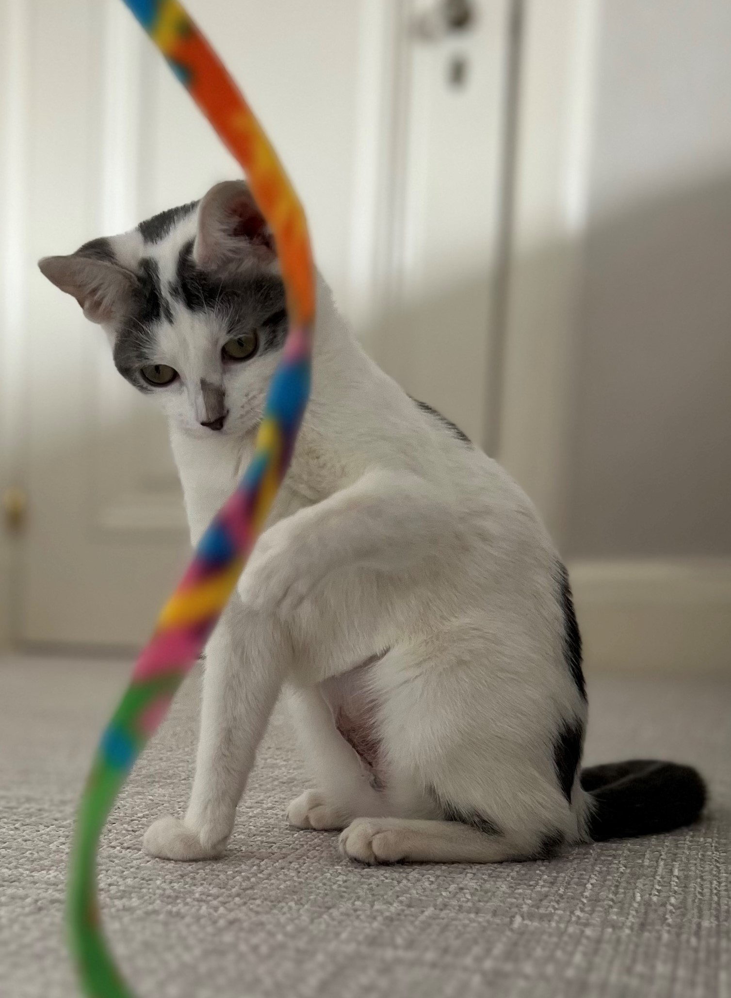 Lara is an amazing kitty. Found on the street with an injured leg and 2 little kittens, Lara took care of her kittens at her foster home. Once her kittens were weaned, Lara underwent surgery to remove her injured leg. Now playful and affectionate, she is active and happily adjusted to losing her leg. She is a bouncy, fun cat who will do best as the only cat in the family.