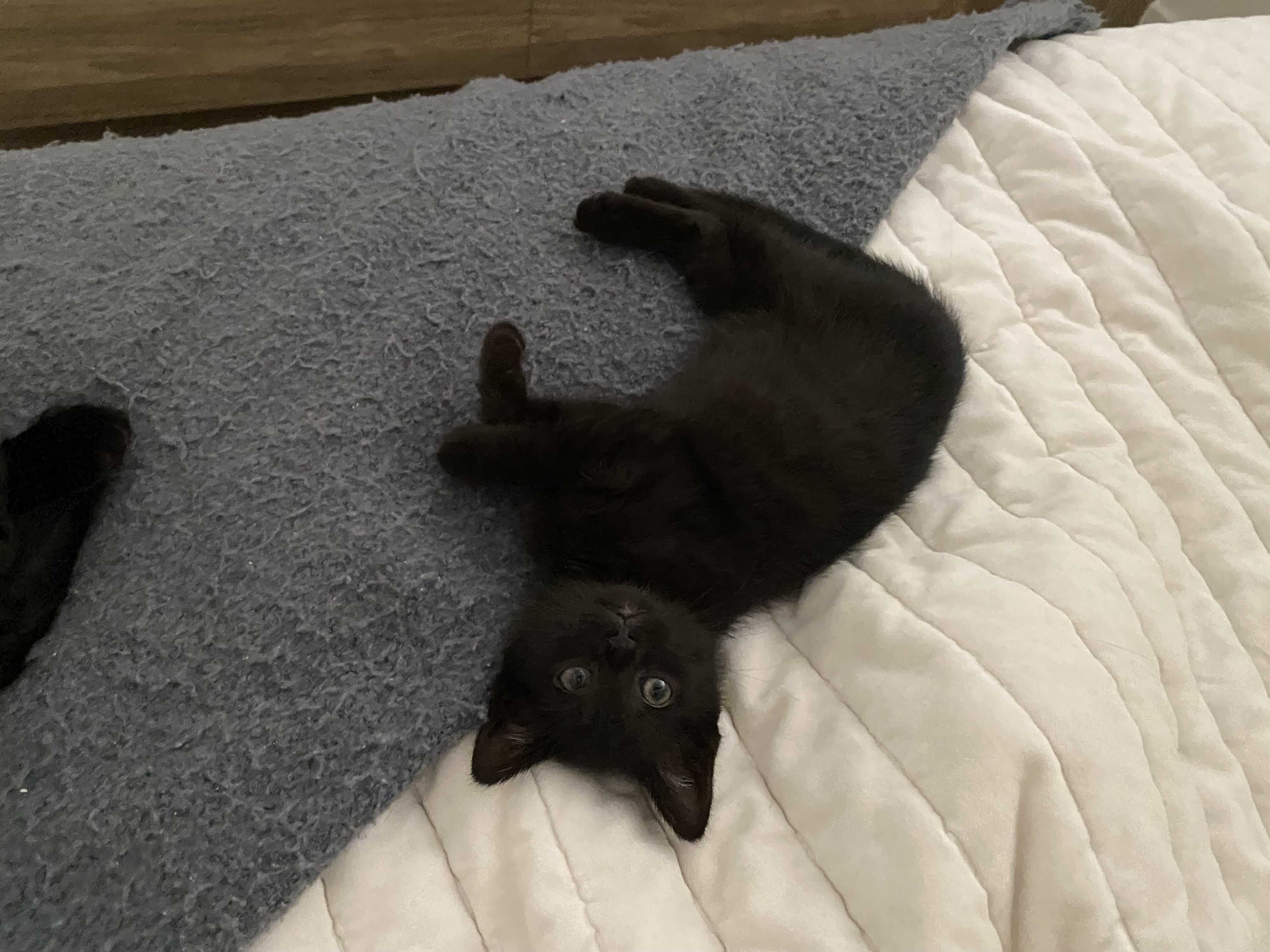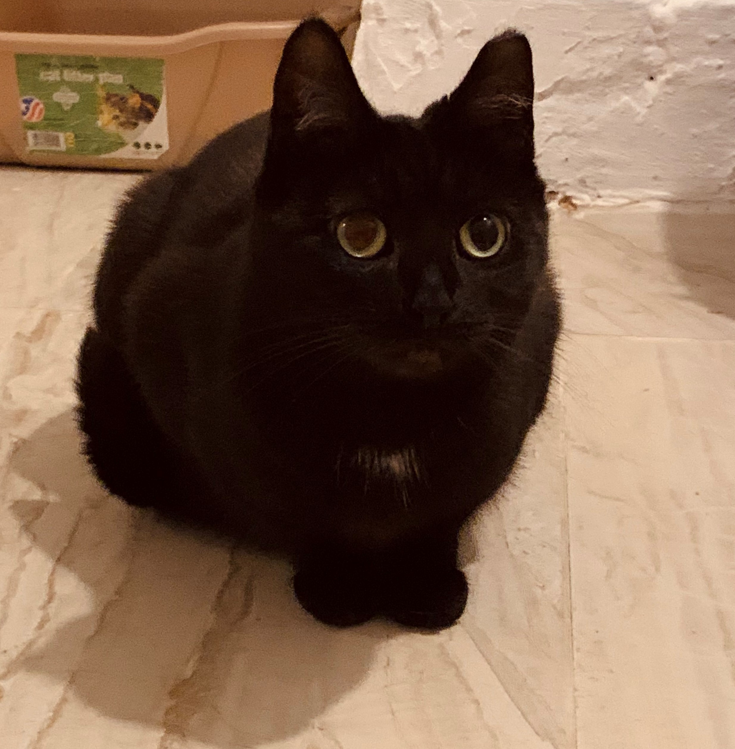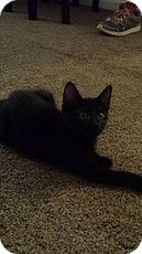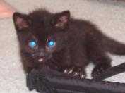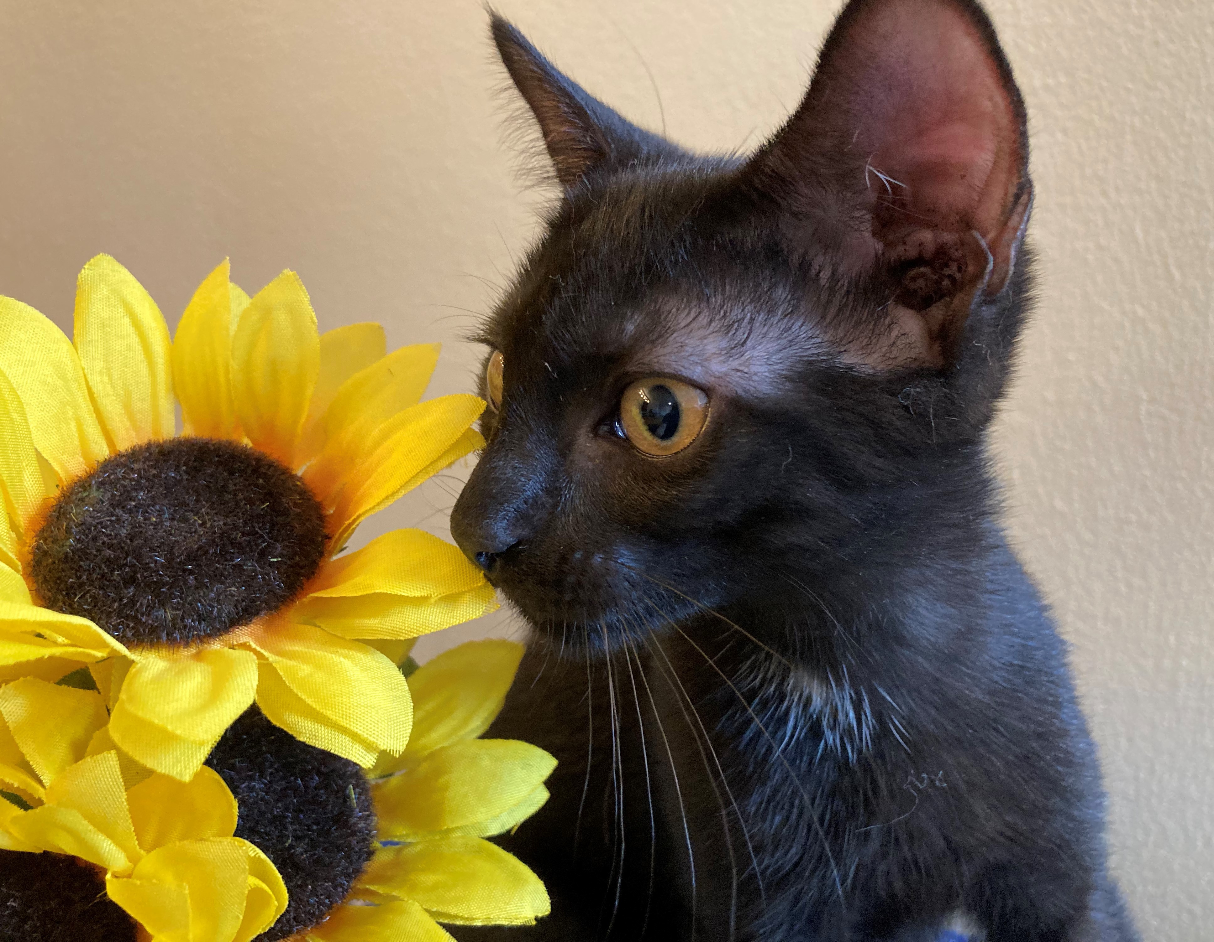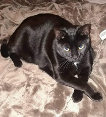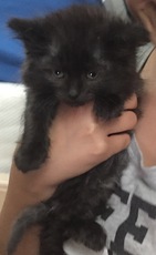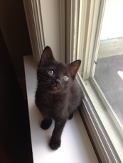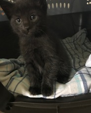 With her lucid eyes peering at you, Luna (last of Harry Potter's Kittens) is a bewitching little sweetheart - 9 weeks old as of 6/9/18. Because of her demure personality, you may be completely unaware that she has sauntered up next to you and would love some special time together. She is very happy go lucky and docile. Solid sleek black, Luna is a standout. You will be a good fit for Luna if you want a friend to tell your best-kept secrets to. Luna will also let you know when she wants your attention by giving you some friendly gentle taps. Luna can be visited in her foster home or on special adoption events. (kw)