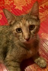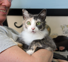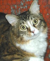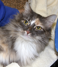 This warm hearted, kindly (medium-haired) calico will hang back at first and be a little