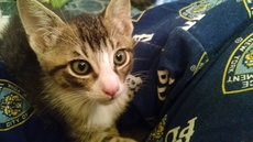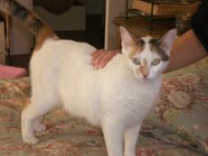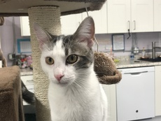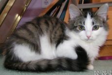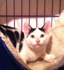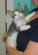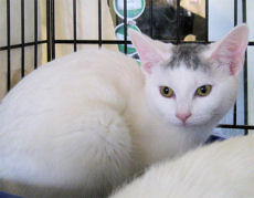 Lucky is an adorable white kitten with hazel eyes, a spotted grey tail as well as a grey spotted head. She is about 4 months old and very sweet & playful. Her mom Penny is also listed.