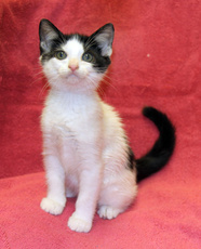 Leo is a lover. He'll coo and call out for company, and when acknowledged, he'll flop down, ready for affection. Leo enjoys being held and cuddled. Along with his sweet side, this little guy loves to romp. Got a foil ball or a squeaky mouse? Leo's on it! Leo makes friends with dogs, other cats and, of course, he likes the company of his litter mates (Charlie, Sky & Rocco, also available for adoption). This pretty boy was born about mid-May.