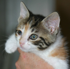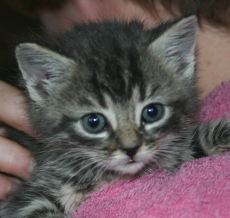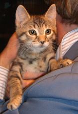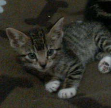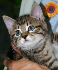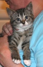 is a gentle kitten, 9 weeks old with striking tabby markings. Very happy, very good.