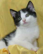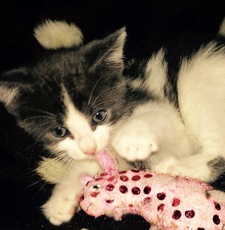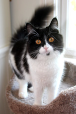Lucy is a beautiful fuzzy Tuxedo kitten, about 4 1/2 months old. She has the most adorable markings and is super sweet & playful. She purrs like a motor boat when petted and loves to plays soccer with her little toy ball. Lucy loves the company of other cats. This cutie will capture your heart!