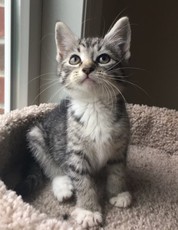 Born Early April 2021 Lennon is the biggest boy in this bunch of 5 kittens. He has distinct black and gray markings with an adventurous, outgoing personality. He's the first one to try anything and everything. He's very playful and definitely the leader of the pack. He's not shy and will take over your lap even if it means pushing through a pile of his siblings. He's affectionate as he is playful, easily held and quite a talker. He won't let you forget he's in the room and please don't be late with his dinner! Lennon will be ready for adoption towards the end of June.