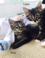 These 8-week old kittens just came to us from Louisiana, hence their names Louise and Anna. They are sisters and are very healthy, happy, affectionate and playful. Currently with a foster family, these beauties are very good with children, litter box savvy, and love to play and relax just the same. Anyone would be lucky to have these little loves in their forever home.