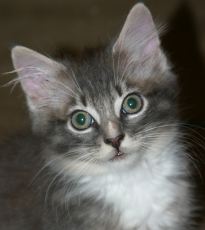 is an adorable 11 week old grey/white fluffy kitten. Playful, friendly and curious.