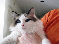 Lulu is a love and has the most beautiful deep blue eyes. We think Lulu is a Bicolor Ragdoll because of her easy going personality and the overall description of that breed. She's very sweet and approx. 2 to 3 years old. She loves belly rubs, pets and sleeping next to you in bed. She's in a foster home with 5 other cats and 7 dogs. Though she really doesn't interact with them she shows no aggression toward them - she would rather be with her foster mom. She's been spay, shots, microchipped and came to us declawed.